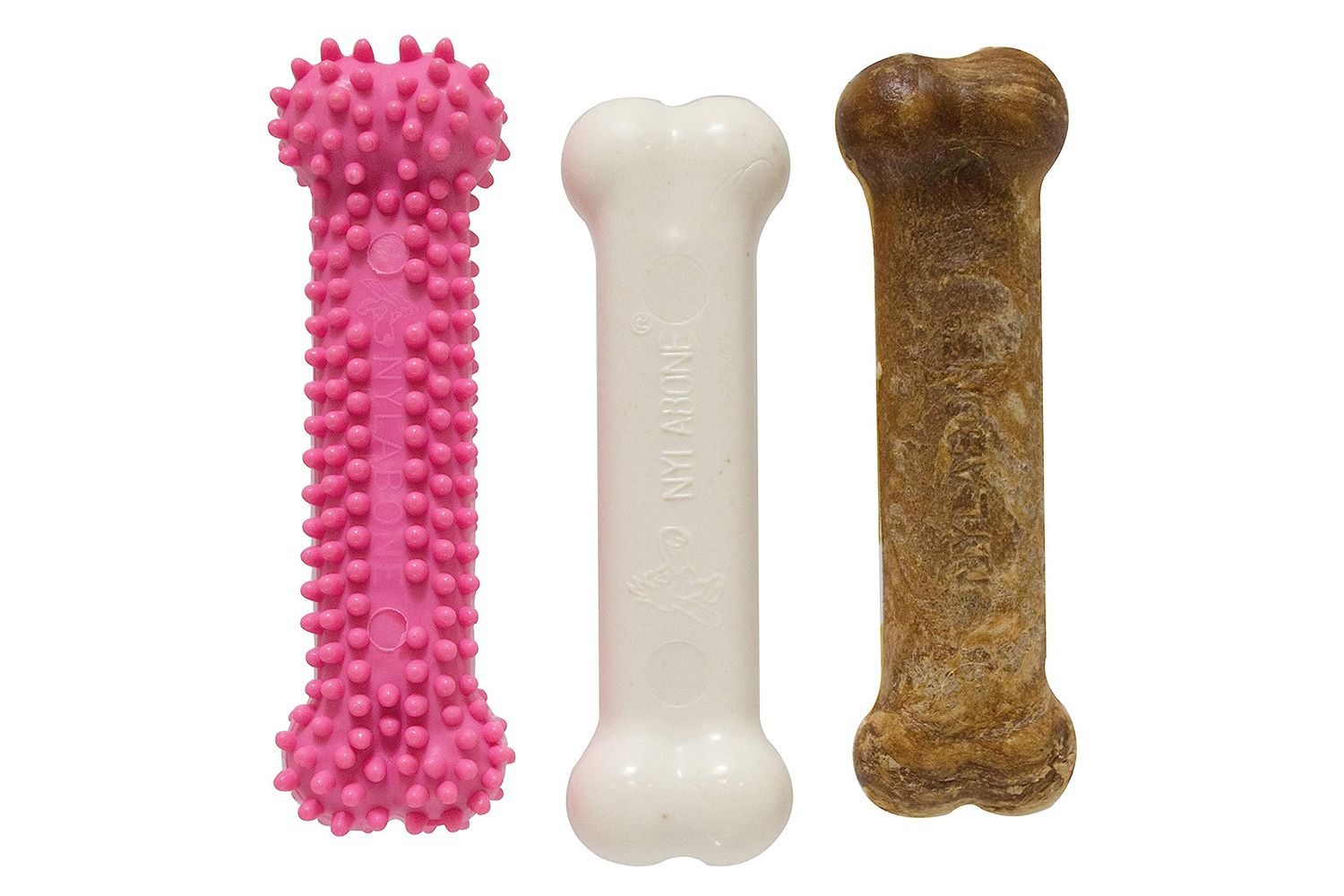 We tested this pack with two Jack Russel Terrier puppies who particularly enjoyed the bacon-flavored Nylabone but were easily able to chew down the textured Nylabone with their puppy teeth.