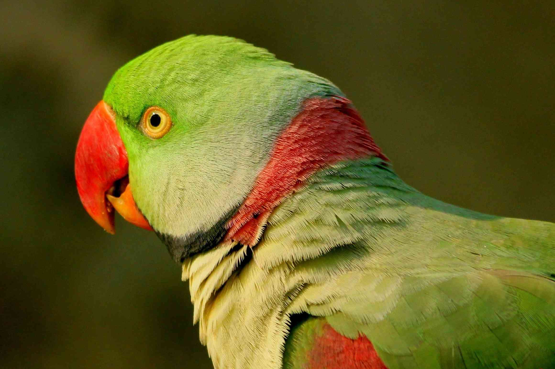 物理特性:主要为绿色,脸颊和脖子后面有蓝灰色光泽;黄绿色的腹部;栗色的肩贴;雄性有黑色和玫瑰色的颈环